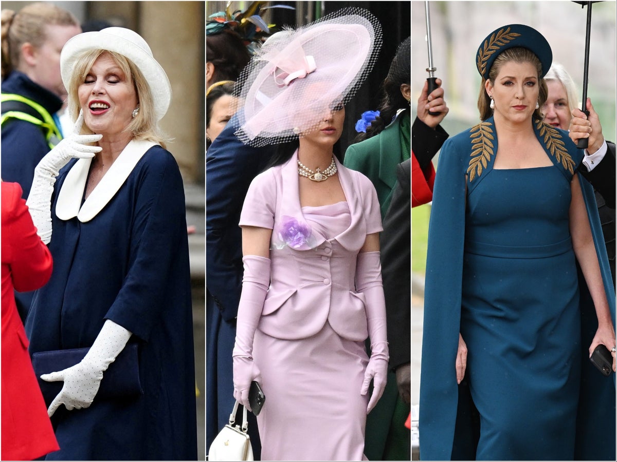 “I Kissed A Girl” singer Katy Perry arrived at Westminster Abbey in a lilac tailored dress, complete with a corset-style waistcoat by Vivienne Westwood. She also wore a large matching fascinator and pearl Westwood choker with a signature golden orb, paying tribute to the late designer who died last year.