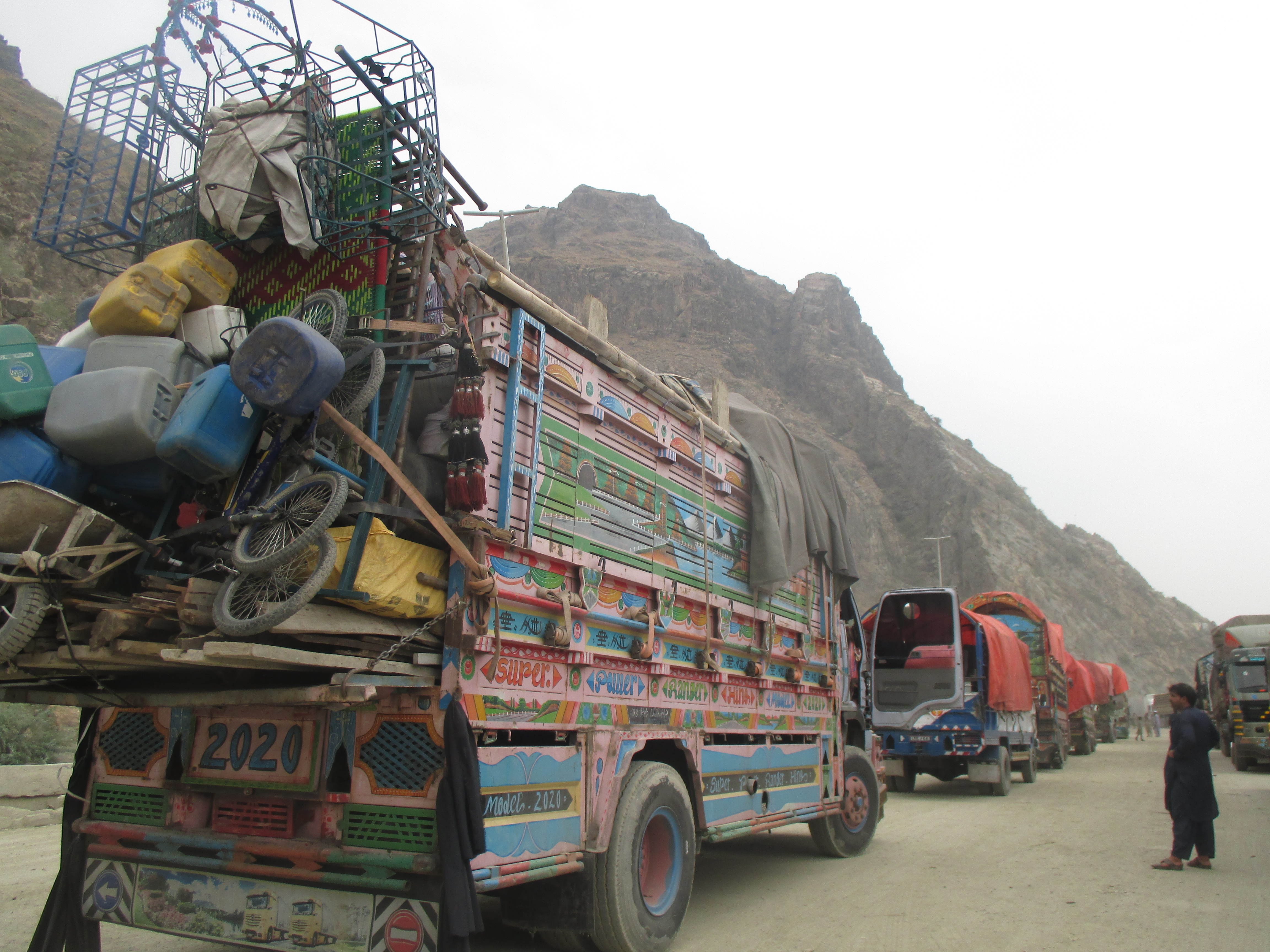 A line of trucks waits at the Torkham border where Afghan refugees are leaving for Afghanistan after the announcement. Photo by Somaiyah Hafeez.