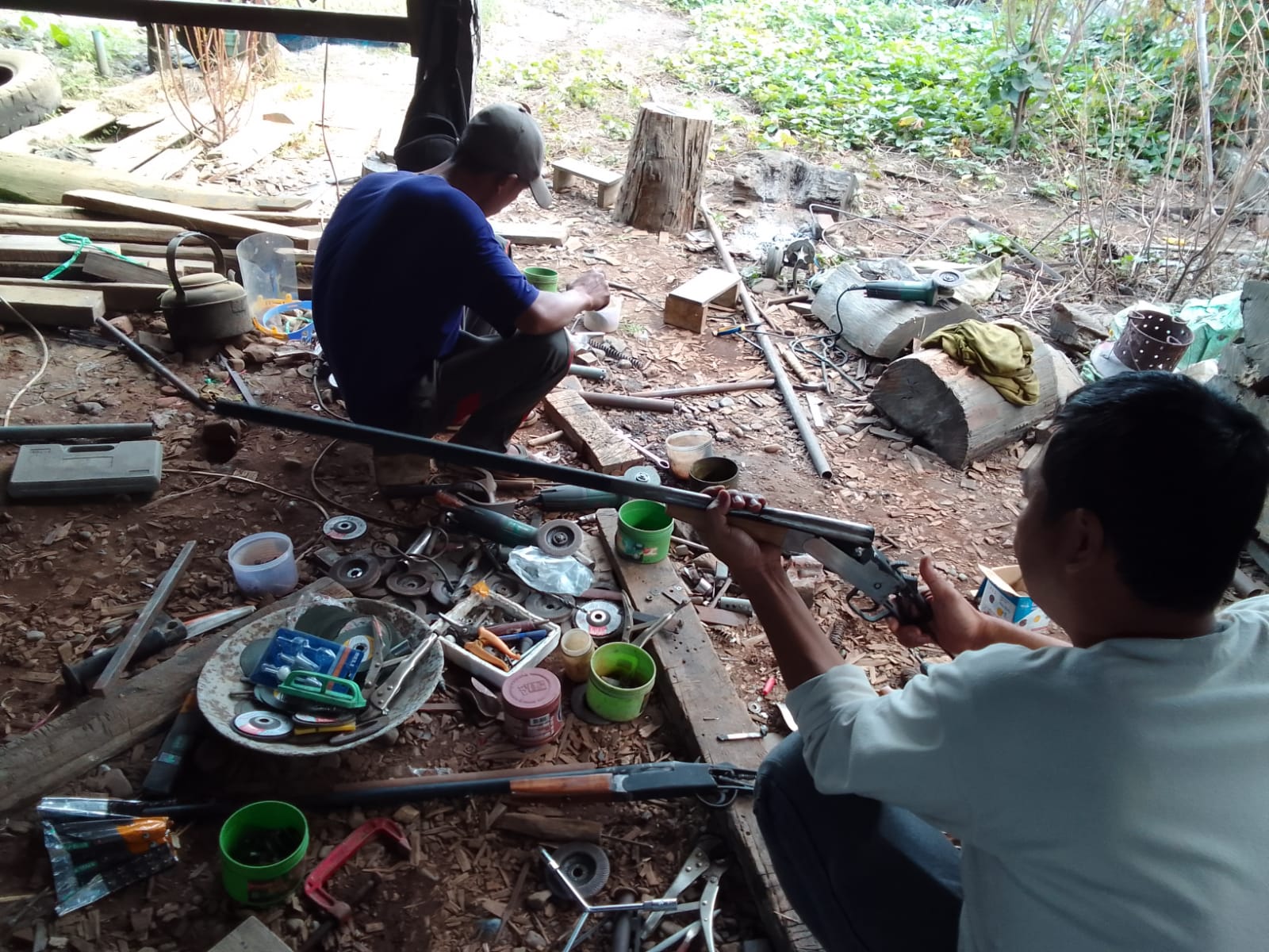 Liang (right) examining a 12-bore gun at the weapons manufacturing unit in Kalay, Myanmar. Photo by Rajeev Bhattacharyya