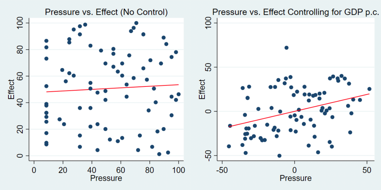 As the graphs above show, correlation between “pressure” and “effect” emerges when controlling for GDP per capita.