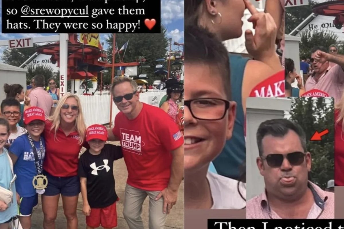 Marjorie Taylor Greene‘s boyfriend Brian Glenn shared an image on his Instagram story of them posing with kids in MAGA hats, only to notice afterwards that people in the background appeared to be photobombing them.