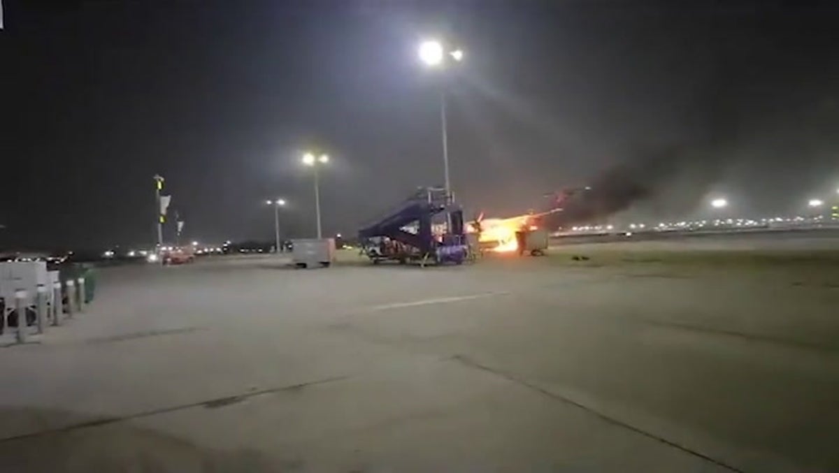 Fire crews and ground staff brought the blaze under control at around 8pm local time. Airport officials blamed the ‘burning of residual fuel’ and said there were no injuries.