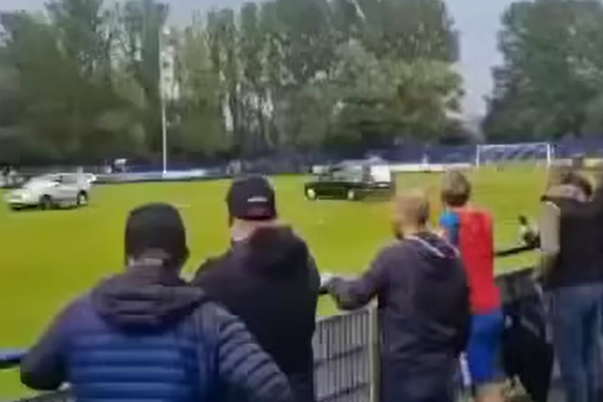 The friendly between non-league teams Gateshead and Dunston was called off on Friday at half-time after the hearse was driven on to the pitch at Dunston’s UTS Stadium, Tyne and Wear, along with a Subaru, shortly before 8.20pm.