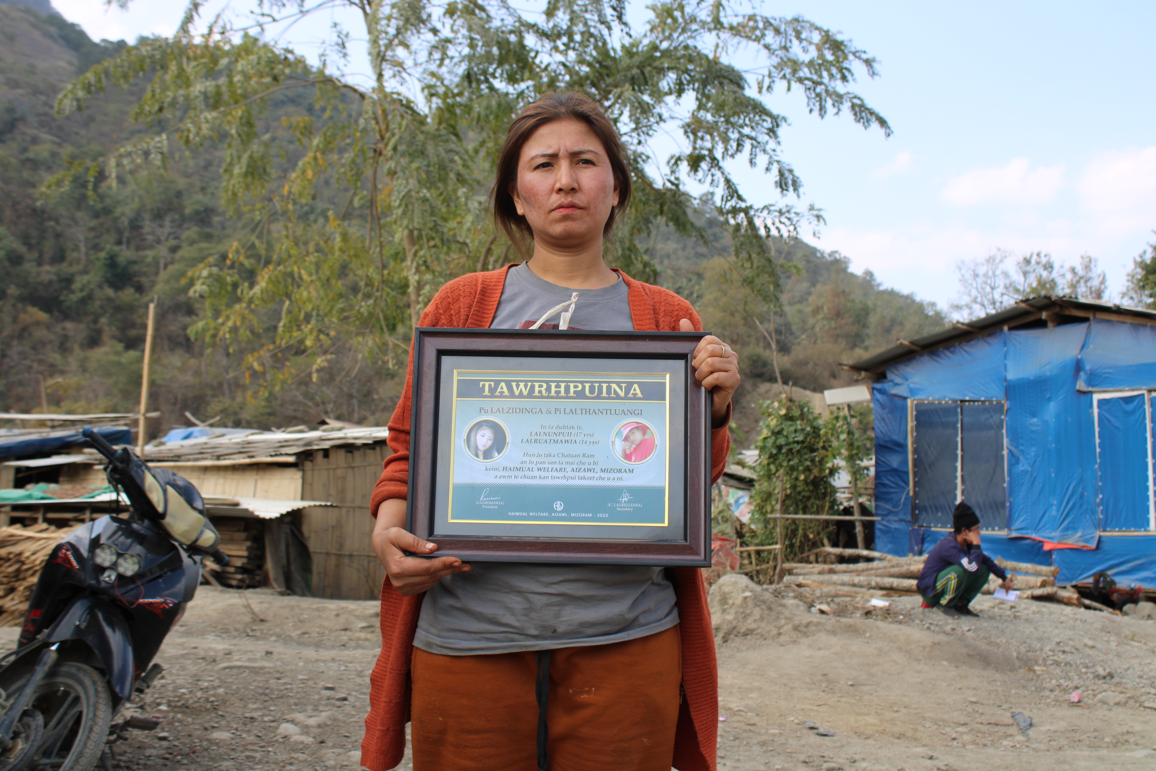 Lalthantluangi holding a condolence plaque at a refugee camp in Zokhawthar, India, that she received from an NGO for her two deceased children killed by the Myanmar junta. Photo by Rajeev Bhattacharyya