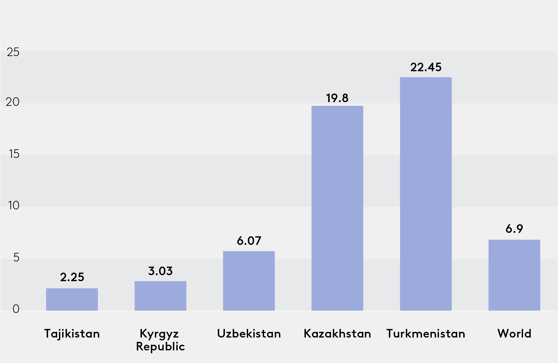 The levels of greenhouse gas (GHG) emissions differ significantly among Central Asian countries. The exports of Turkmenistan and Kazakhstan are highly dependent on hydrocarbons, and as a result, they produce high GHG emissions (22.45 and 19.8 CO2 equivalent tonnes, respectively) through fugitive emissions. Conversely, the Kyrgyz Republic and Tajikistan demonstrate the lowest levels of GHG emissions (3.03 and 2.25, respectively) due to their substantial reliance on hydropower in the energy sector.