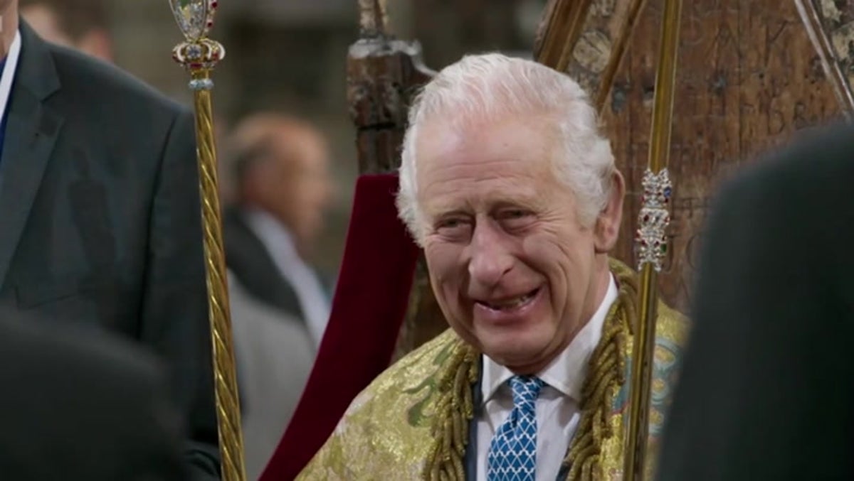 Behind-the-scenes footage from King Charles III’s Coronation rehearsals shows the monarch laughing as the Archbishop of Canterbury trips up over his words.