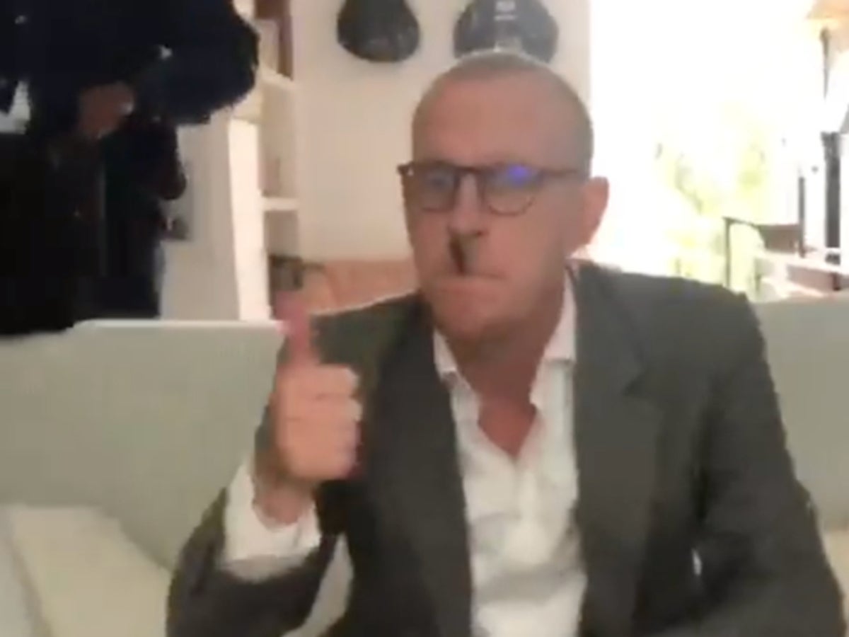 He then takes a drag on a cigar and puts his thumb up to the camera.