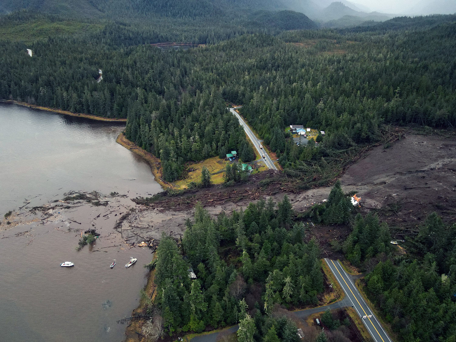 The landslide, estimated to be 450 feet wide, occurred following heavy rain and winds in the area. It cut off about 54 homes from town. Around 35 to 45 people have chosen to stay in the area, said Mason Villarma, interim borough manager.