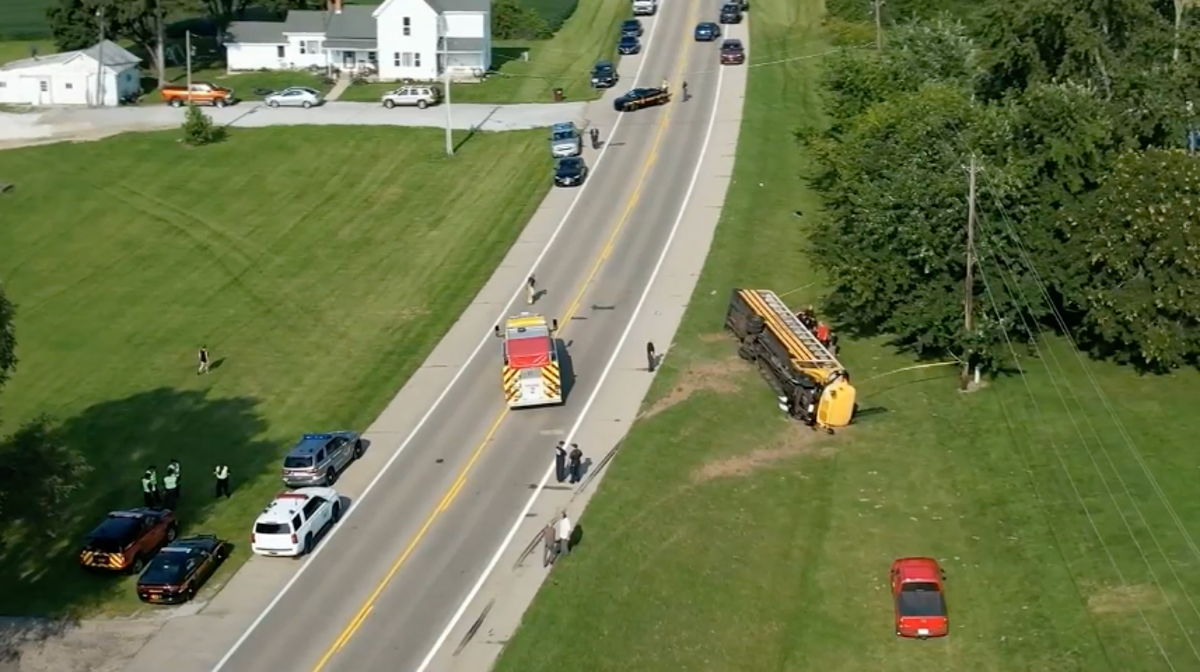 A bus taking elementary school students to the first day of classes in Clark County, 30 miles northeast of Dayton, flipped over as its driver tried to avoid a van that swerved into oncoming traffic, according to the Ohio State Highway Patrol.