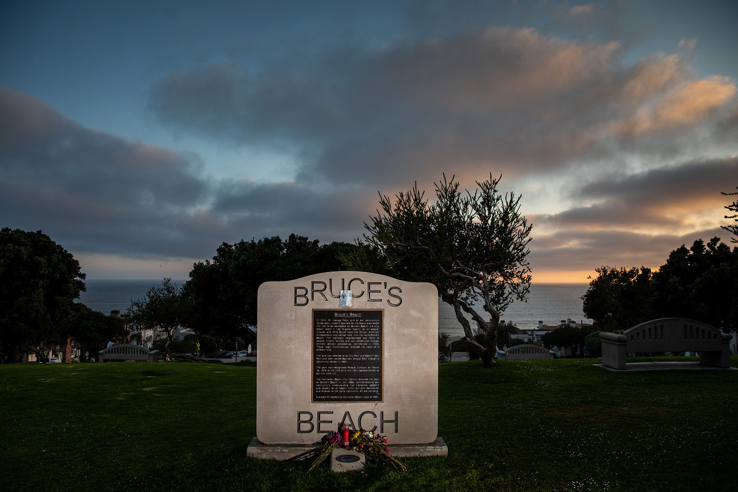 The plaque notes that the Bruces settled on the Strand in Manhattan Beach after being turned away from other coastal communities. It states that the process of seizing their property also ensnared the property of neighboring Black families, as well as that of several white families who had plans to develop their parcels.
