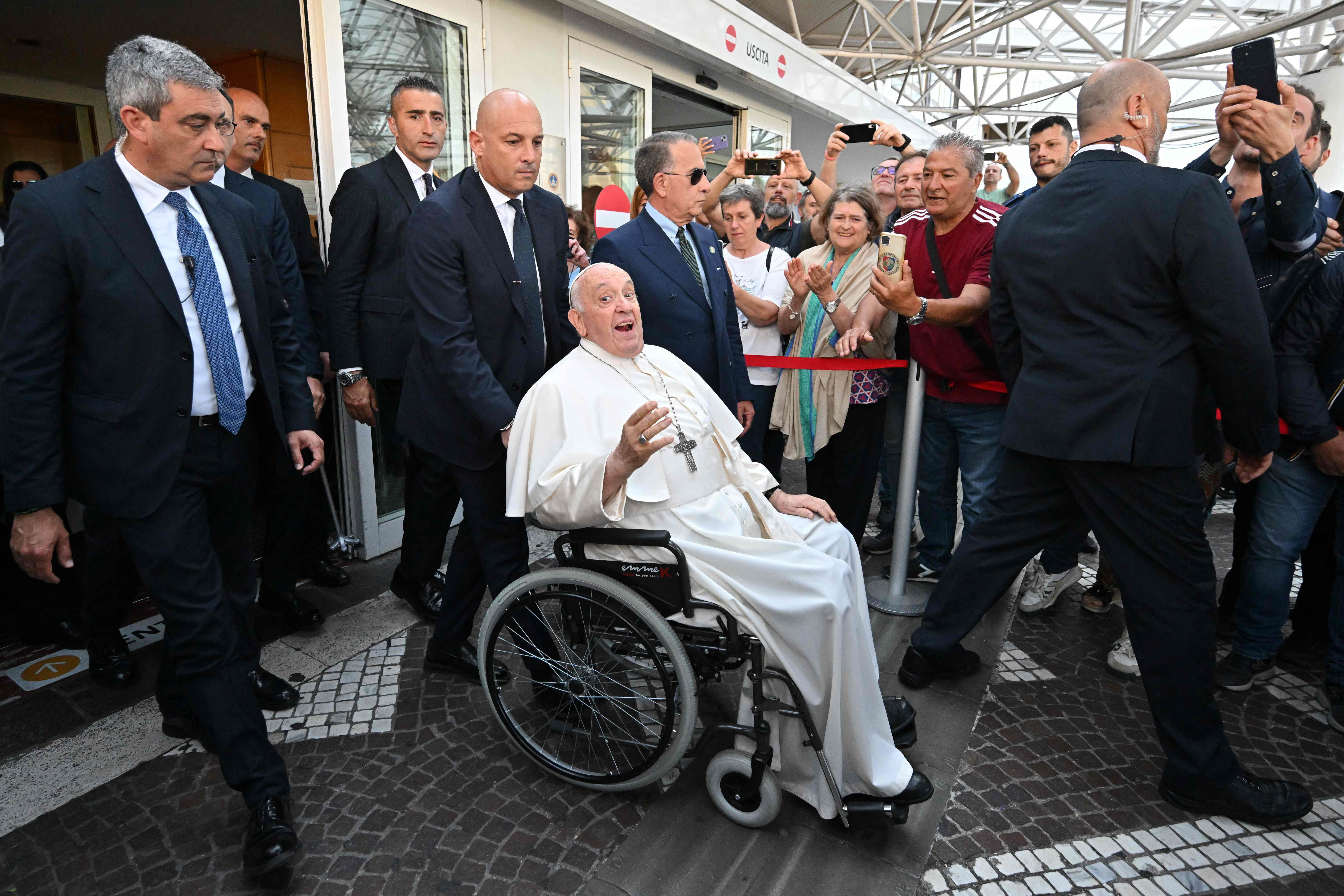 Francis, 86, left through Gemelli Polyclinic’s main exit in a wheelchair, smiling and waving and saying “thanks” to a crowd of well-wishers, then stood up so he could get into the small Vatican car awaiting him. In the brief distance before he could reach the white Fiat 500, reporters thrust microphones practically at his face, and the pontiff seemed to bat them away, good-naturedly.