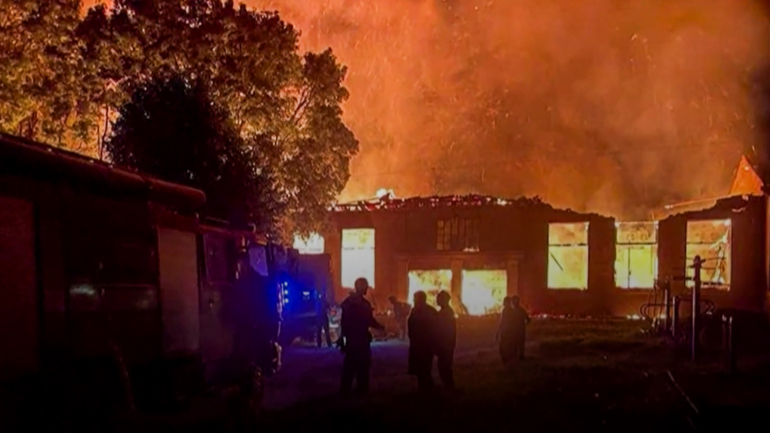 In a separate post on his own Telegram channel, regional Gov. Oleh Syniehubov said initial reports suggested two men had died and another four were injured in the “large scale fire.”