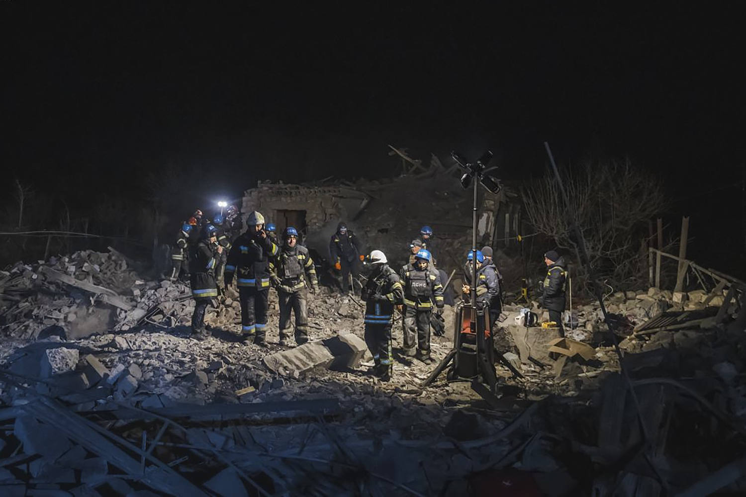 Rescue efforts extended into the night. Pictures posted online by regional governor Vadym Filashkin showed teams sifting through piles of smoldering rubble in the dark as well as a burned-out vehicle.