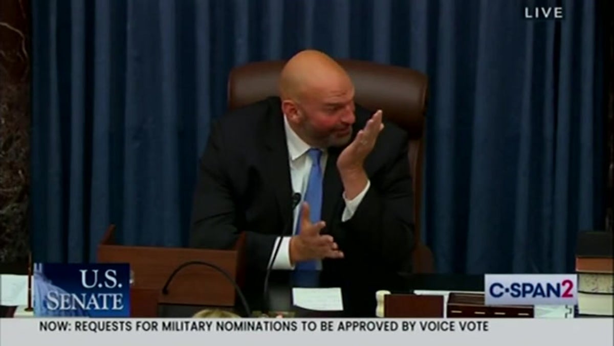 John Fetterman was seen laughing in dispair as Tommy Tuberville continued his blockade of military promotions.