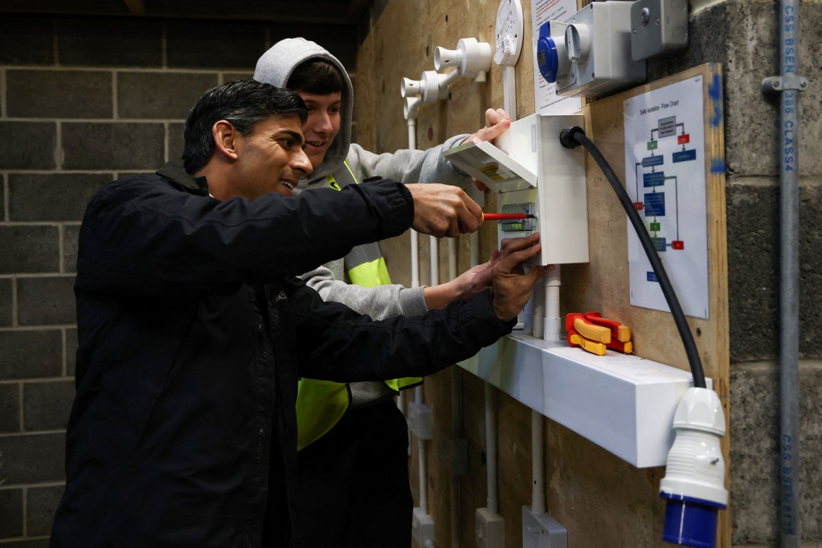 Rishi Sunak admitted he had a “stressful moment” as he helped apprentices wire a fuse box at a construction training centre in Scarborough.