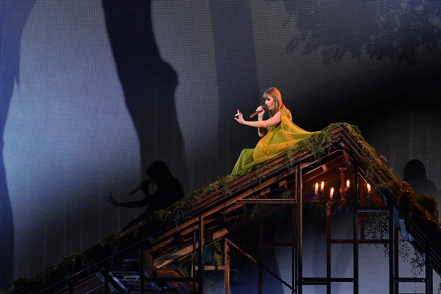 To start the “Folklore” portion of the show, Swift lies down on the grassy roof of a cabin to sing the first track from the album. In videos shared across social media of the incident, as Swift walked down the roof, she stumbled.