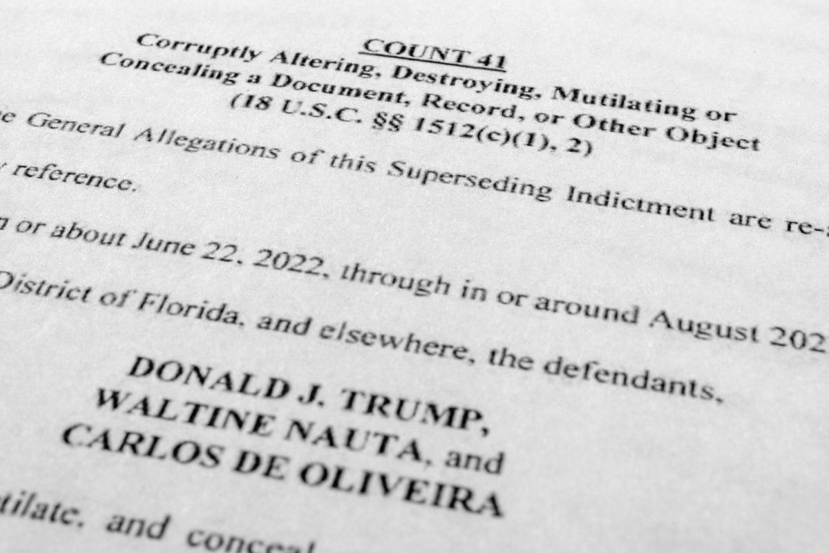 The updated indictment against former President Donald Trump, Walt Nauta and Carlos De Oliveira is photographed Thursday