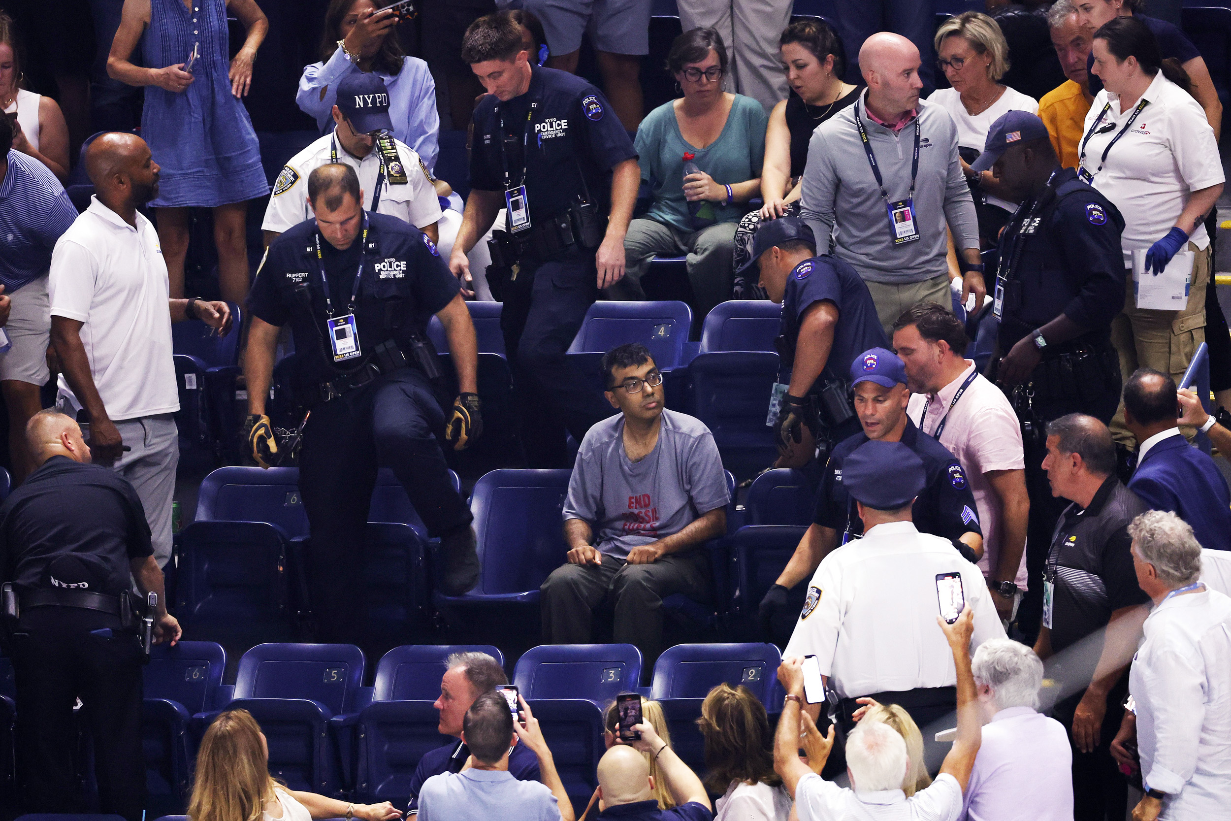 There were four protesters in all, the U.S. Tennis Association said in a statement Thursday night. Three were removed and escorted out of the stadium while the fourth “affixed their bare feet to the floor of the seating bowl.”