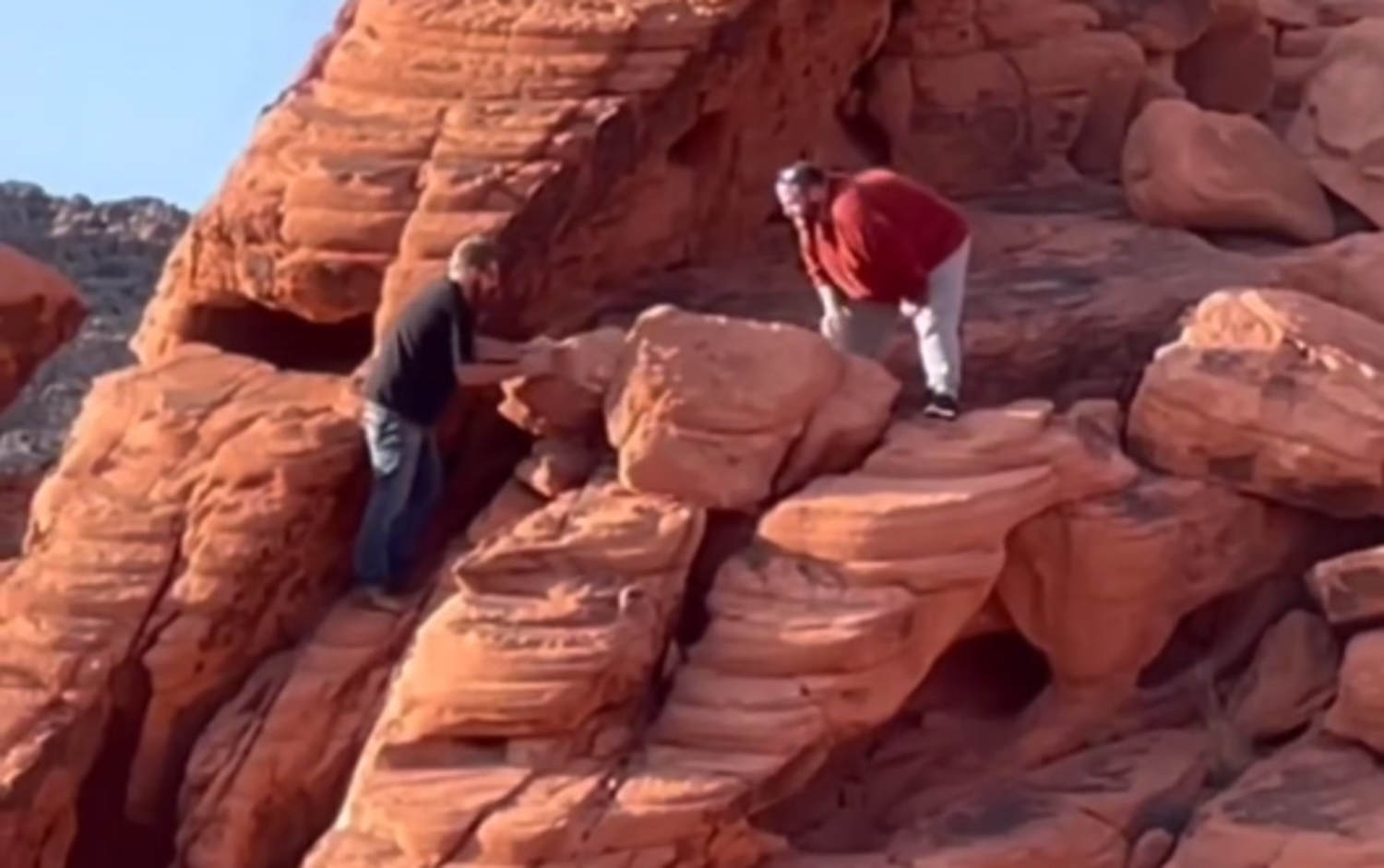 The video shows the two men shoving sandstone chunks over the edge of an outcropping as someone else screams. Lake Mead National Recreation officials say the incident took place near the Redstone Dune Trail on the north side of the lake. Park officials said the damage done is irreparable.