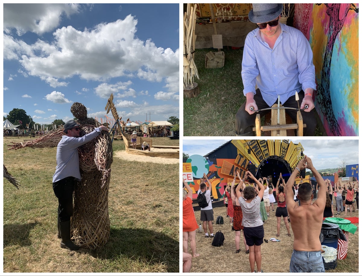 Wandering into the Craft Field to lose myself in ancient handiworks, I while away a pleasantly earthy and confidence-building half hour whittling my daughter a magic wand using a “bodging” technique on shave horse and draw knife. “It’s never quiet,” my instructor Phil tells me – eight years in the Craft Field, 10 here with Oxfam previously, and one year as a steward when he was almost run over by Bruce Springsteen. “The Craft Field is massive, it covers everything, metalwork, pottery, materials, wood. This is my favourite area of the festival, here and the stone circle. When you come over the railway line you almost feel the energy change, from chaos to calm.”