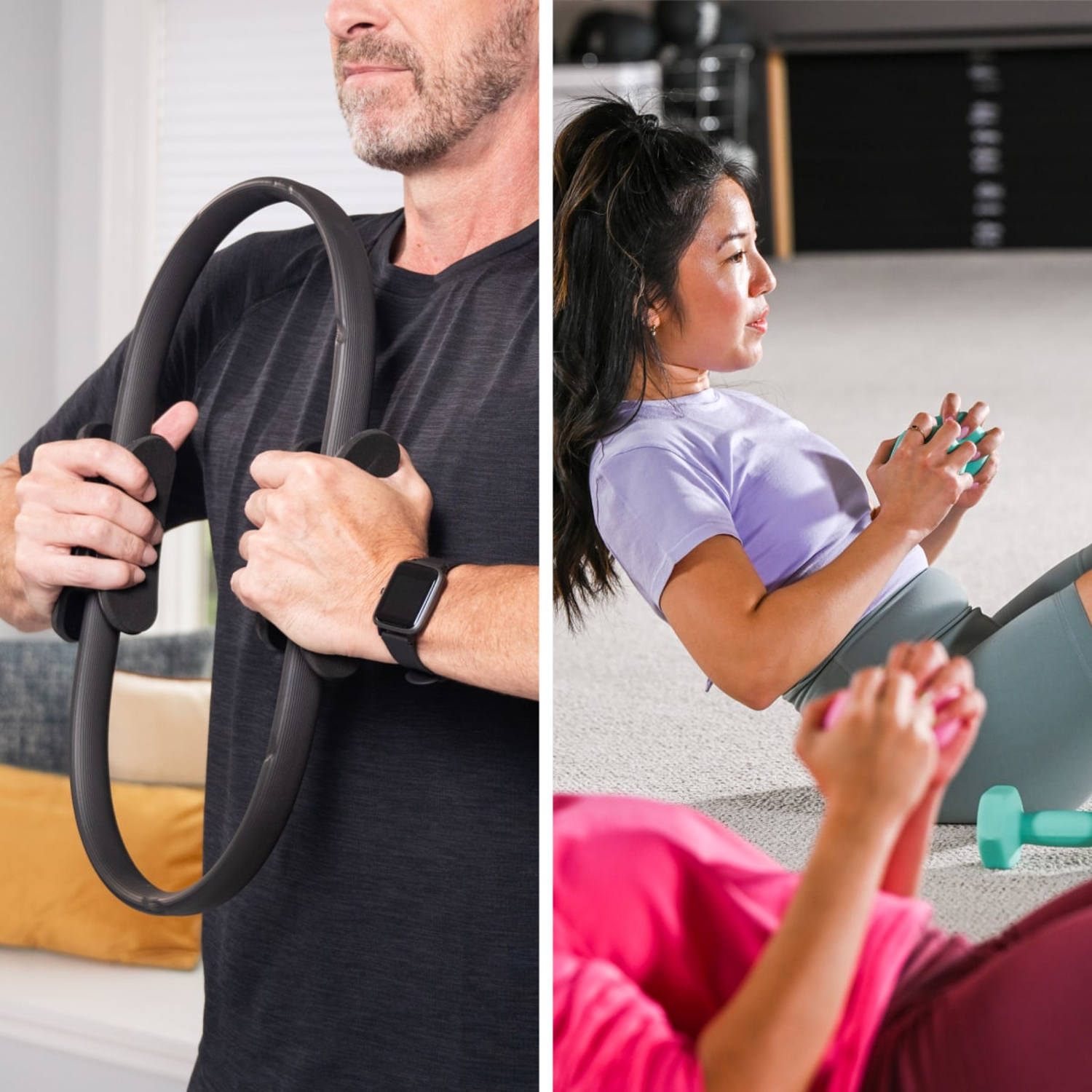 To use a Pilates ring, you can position it between your inner thighs and press inward while standing to work the legs, or between your ankles while lying on your back, lowering and lifting your legs to stimulate the deep core muscles, says Johnson. There are also lots of arm and oblique exercises you can do with Pilates rings.